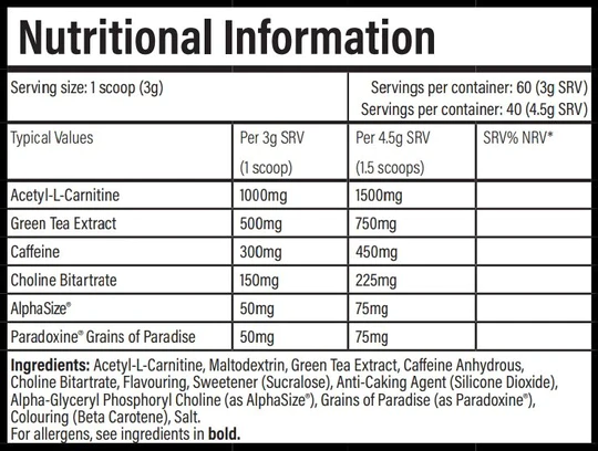 Acétyl-L-carnitine, maltodextrine, extrait de thé vert, caféine anhydre, bitartrate de choline, arôme, édulcorant (sucralose), agent anti-grodésation (dioxyde de silicium), alpha-glycéryl phosphorylcholine (sous le nom AlphaSize®), grains de paradis (sous le nom de Paradoxine®), colorant (bêta-carotène), sel.