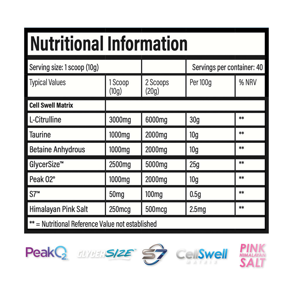- CellSwell Matrix® : Il s’agit d’une combinaison de citrulline, de taurine et de bétaïne sous forme libre, contribuant à la promotion de la vasodilatation et à l’amélioration de la performance musculaire.